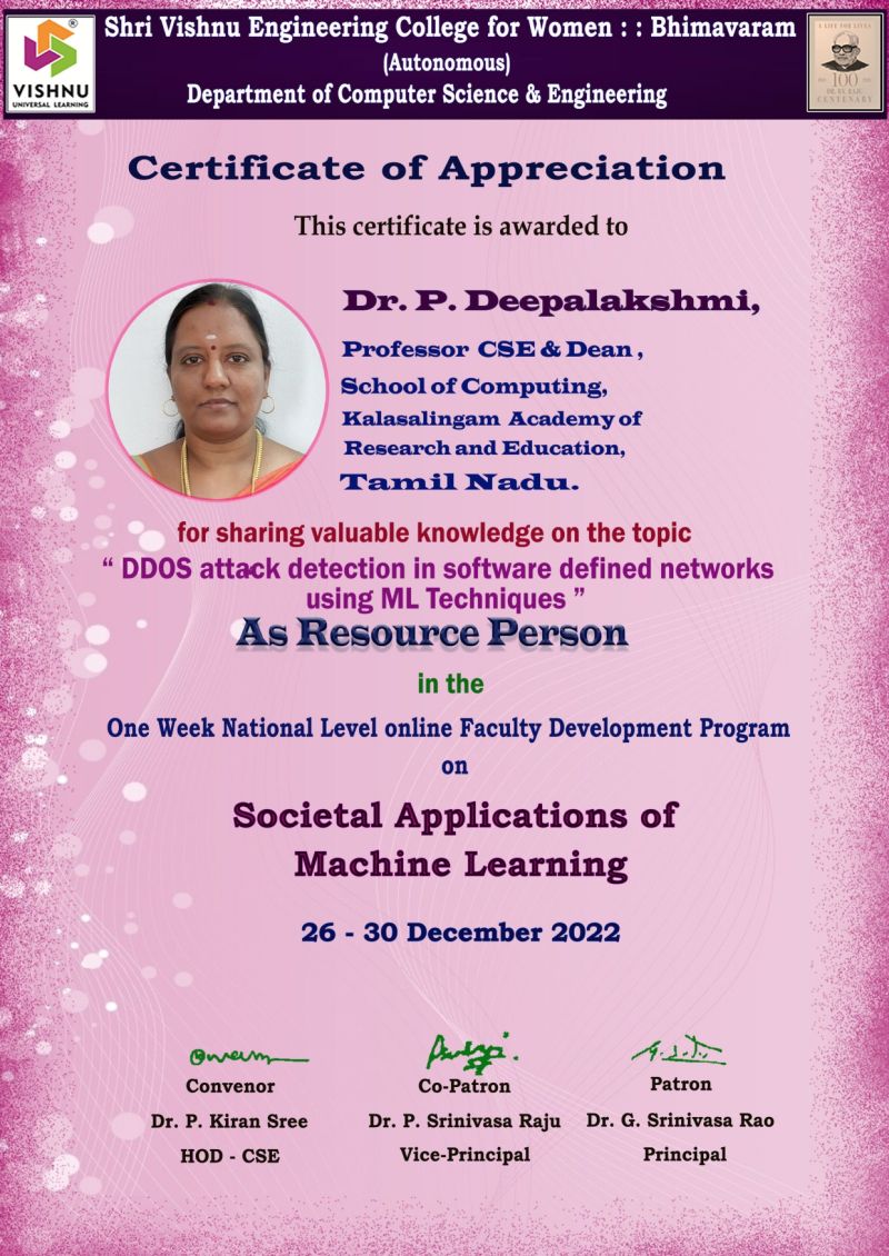 Delivered a talk on DDOS attack detection in SDN using ML Techniques...Thanks to Shri Vishnu Engineering College, AP for inviting me as the speaker.....The FDP topic is an interesting one...Societal Applications of Machine Learning....Had a great time with a huge audience.....Special Thanks to Dr.Kiran Sree, HOD/CSE for the opportunity.